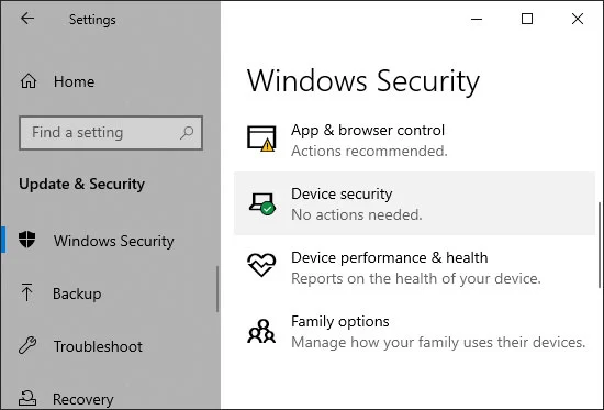 2. ඊලගට ඔයාට කරන්න තියෙන්නේ Update & Security Windows Security Device security වලට යන එක.
