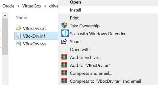 3. දැන් VBocDrv.inf එක right click install කරන්න.