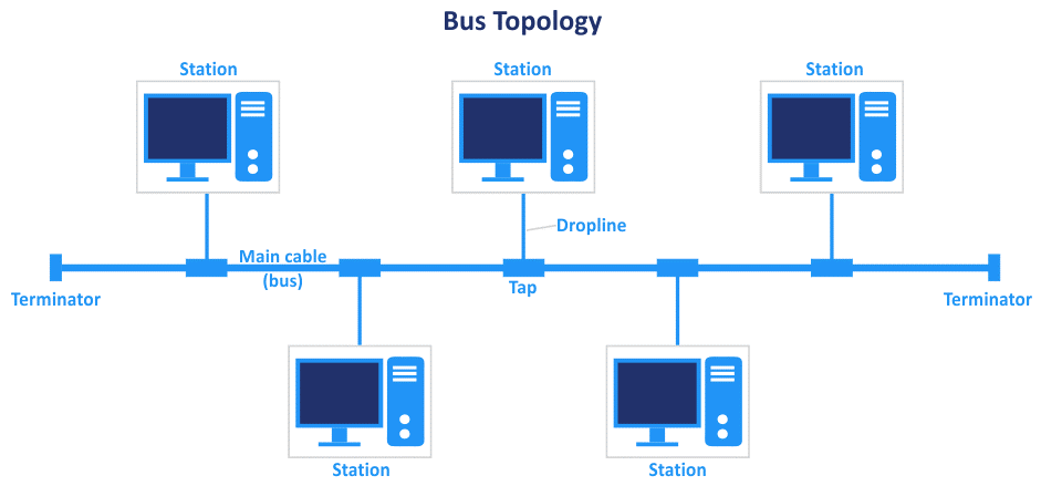 Bus Topology එකේදී main cable එකට computer device connect කරලා තමයි network එක design වෙන්නේ. ඒ වගේම main cable එකේ දෙපැත්තේ terminators 2 ක් තියෙනවා. මේ වගේ network එකකදී එක device එකකින් messages එකක් දැම්මම, network එකට connect වෙලා ඉන්න හැම device එකකටම ඒ messages එක receive වෙනවා. ඒ වගේම තමයි එක device එකකින් දාපු messages එකක් network එකේ transmit වෙනකොට, වෙන device එකකට ඒ time එකේදී messages දාන්න බැ.