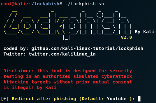දැන් අපි Lockphish install කරගෙනයි තියෙන්නේ. එහෙනම් බලමු කොහොමද මේකෙන් phishing page එකක් හදාගන්නේ කියලා. Lockphish run කරගන්න ./lockphish යන command එක ලබාදෙන්න. එවිට ඔබට පහත ආකාරයේ screen එකක් ලැබේවි.