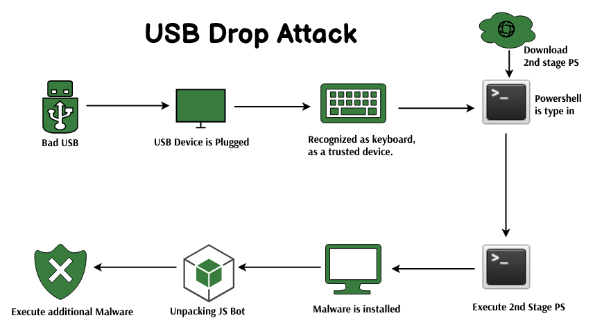 Universal Serial Bus (USB) drop attack එකකදී ගෙඩක් වෙලාවට attacks ලා USB Drive එක අපට ලේසියෙන්ම ඇසට ගැටෙන තැනක තමයි තියන්නේ. හරි Example එකක් විදියට ඔයා මෙහෙම හිතන්නකෝ. ඔයා ABC කියලා company එකක work කරනවා. ඉතිං මේ company එක hack කරන්න hackers ලා ටිකක් බලන් ඉන්නවා. ABC company එක hack කරන්න ඕනි නිසා hackers ලා USB එකකට malicious code එකක් දාලා ABC company එක ලග හිතාමතාම දාලා යනවා.