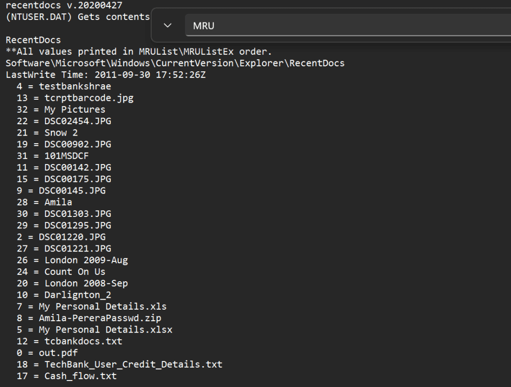 හරි. දැන් අපි RegRipper tool එක use කරලා Sample WR Files-20220820.zip කියන file එකේ තියෙන NTUSER.DAT කියන file එක analysis කරලා recreantly active files මොනවද කියලා බලමු.