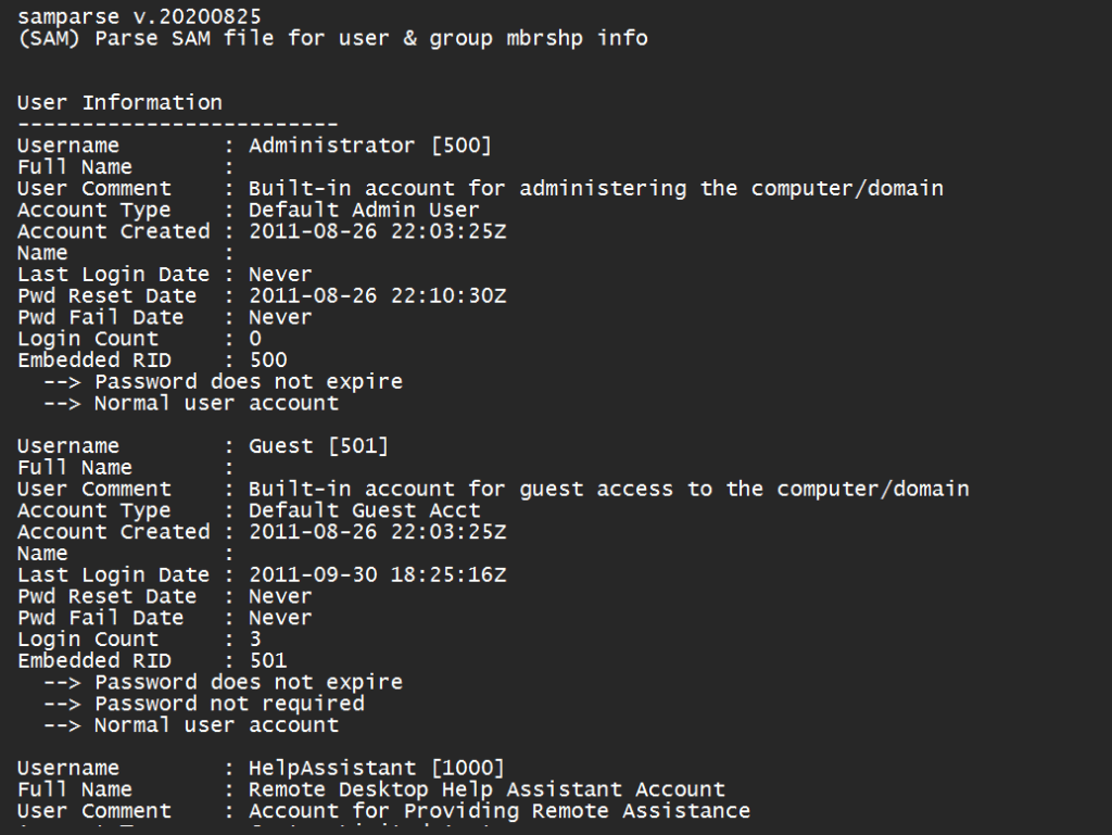 Example එකක් විදියට, කිව්වොත් දැනට system එකේ ඉන්න users ලා කව්ද? එයාලා මොන වගේ user ලද? ඒ කියන්නේ super user කෙනෙක්ද? root user කෙනෙක්ද? Normal administrator කෙනෙක්ද? කවද්ද මෙයාලා system එකට අන්තිමට ඇතුල් උනේ? එතකොට එයාලගේ usernames මොනවද? SID මොනවද? encrypted passwords මොනවද කියලා අපට බලා ගන්න පුලුවන් වෙනවා.